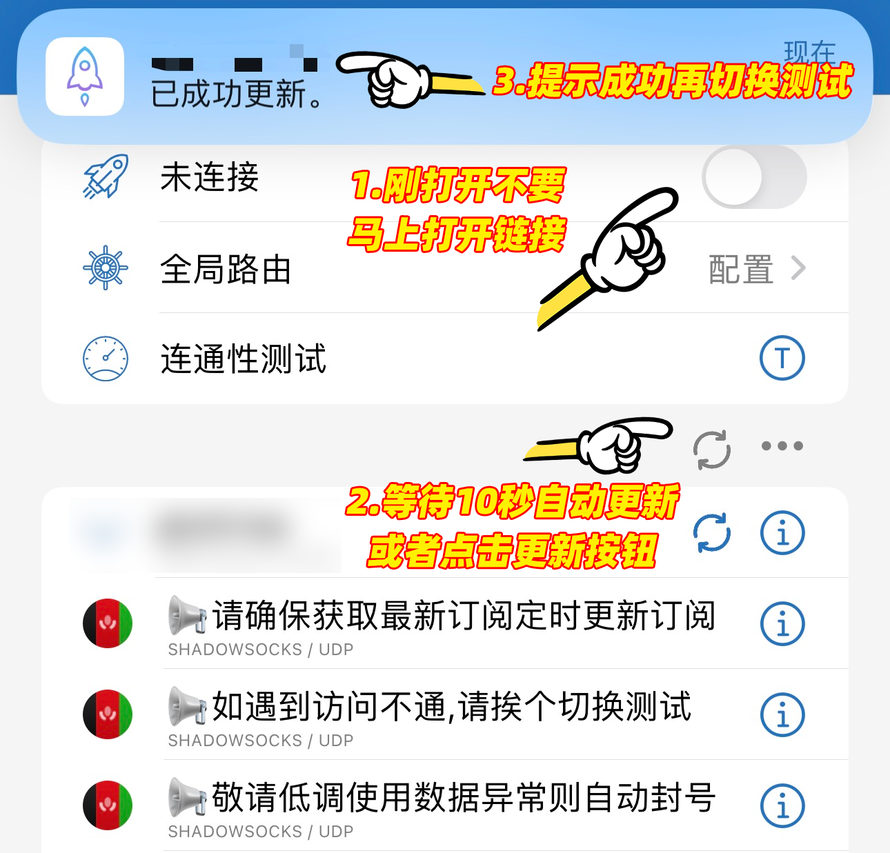 第二步:确保没有开启链接的情况下点击更新订阅