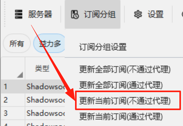点击订阅分组,点击更新当前订阅(不通过代理)