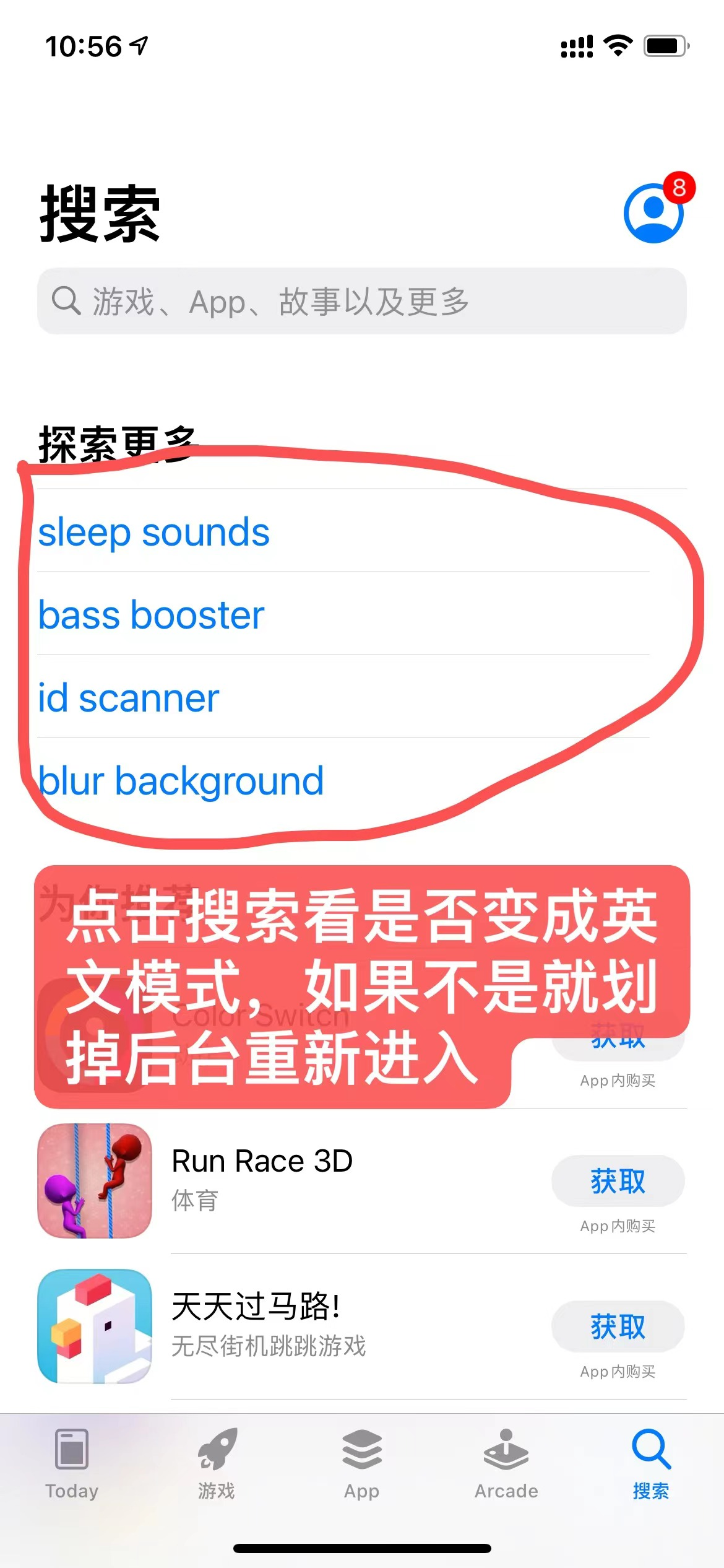 3.点搜索按钮,看是否变成外语状态。如不是外语状态,请划掉APP-STORE后台,再次打开软件